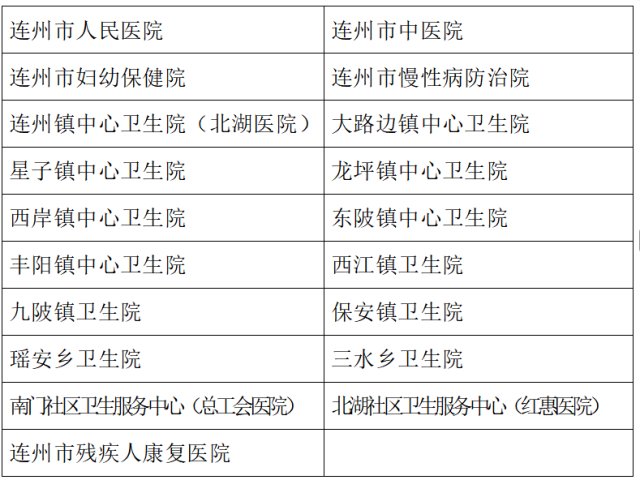 答:2026年1月1日開始,連州全市所有公立醫(yī)療機(jī)構(gòu)開展相應(yīng)服務(wù)(具體名單見下表)。